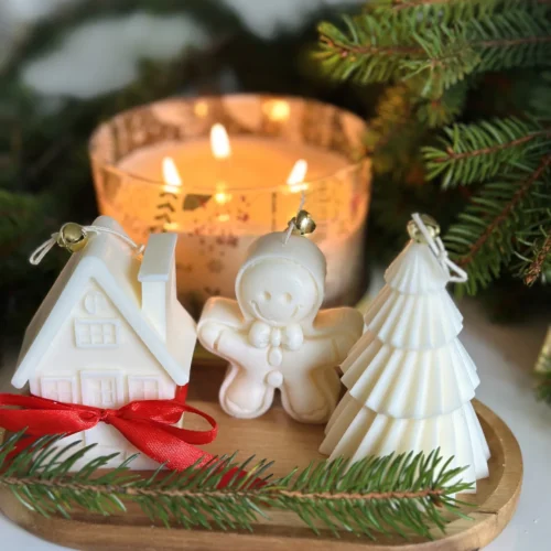 Zestaw 3 świec sojowych – domek, pierniczek i choinka M