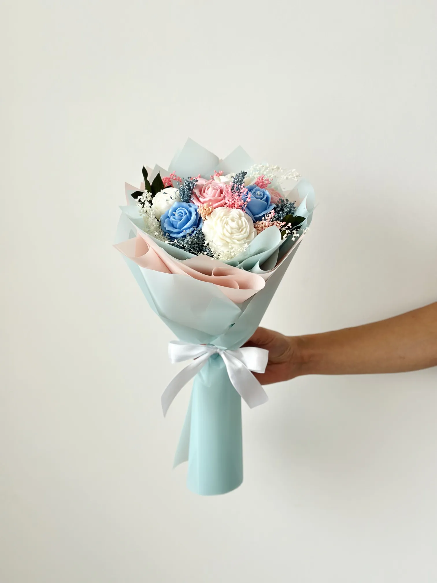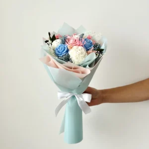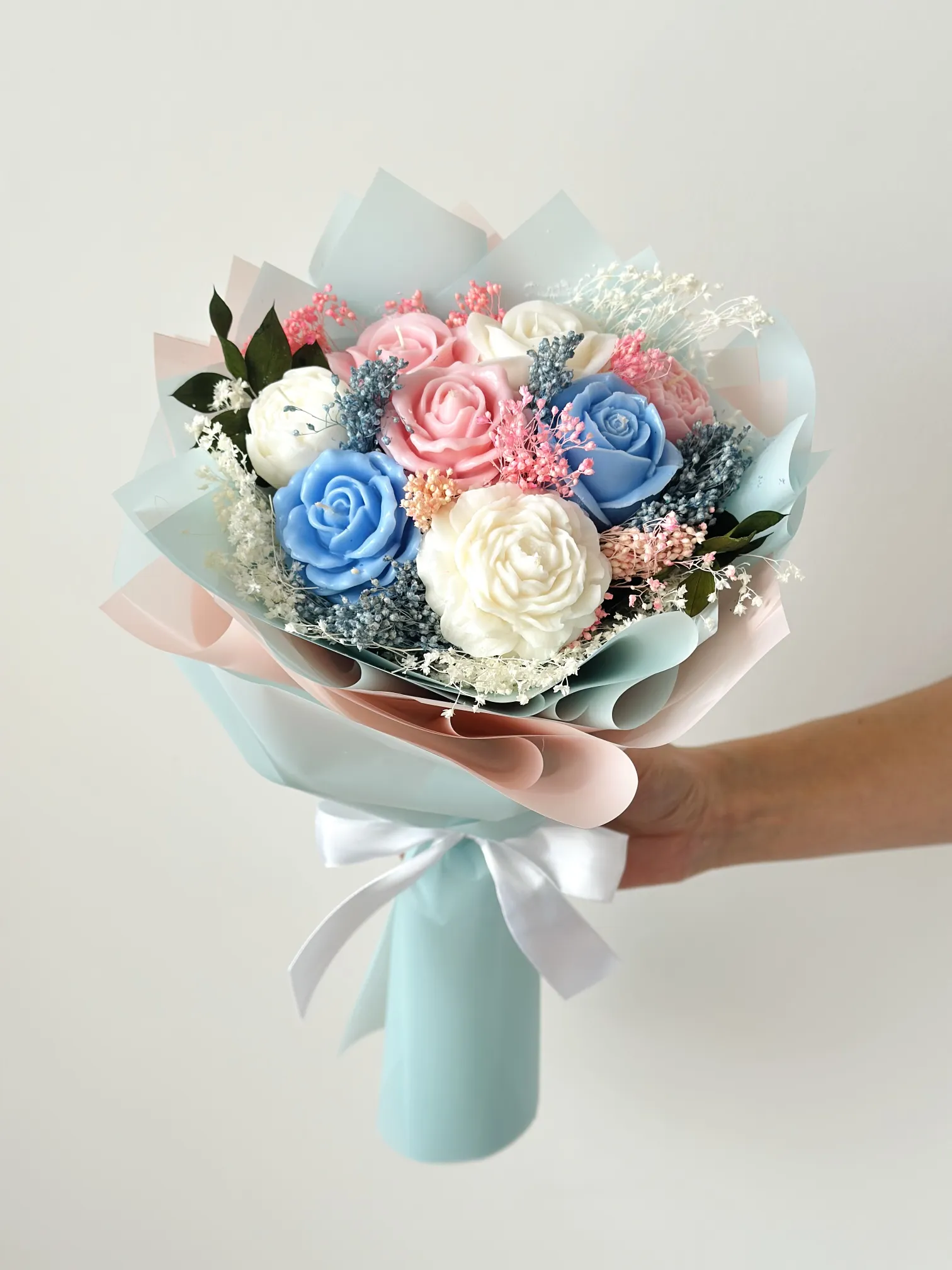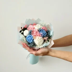 Wyjątkowy bukiet wykonany z naturalnych świec sojowych w kolorze biało-różowo-niebieskim to oryginalna alternatywa dla klasycznych kwiatów. Subtelna kolorystyka i dekoracyjna forma sprawiają, że bukiet doskonale sprawdzi się jako prezent na Dzień Babci, na urodziny, Walentynki, Dzień Kobiet lub inną wyjątkową okazję.