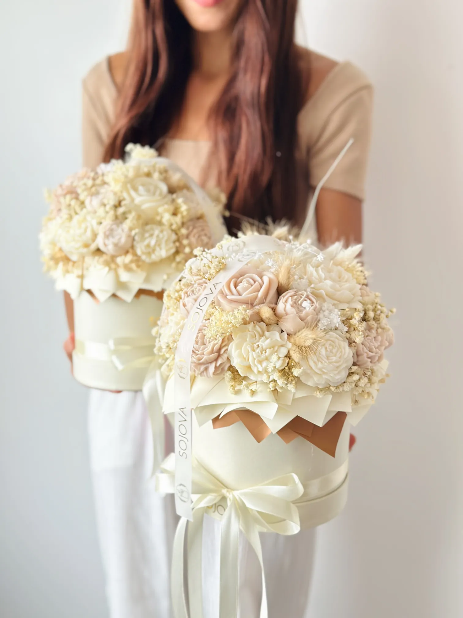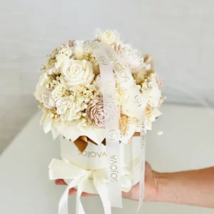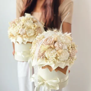 Ręcznie wykonany flowerbox w kremowym pudełku, utrzymany w naturalnej kolorystyce brązów, beżu i kremu. Kompozycja składa się z suszonych kwiatów, traw i dodatków w stylu boho, dzięki czemu prezentuje się ciepło i stylowo.