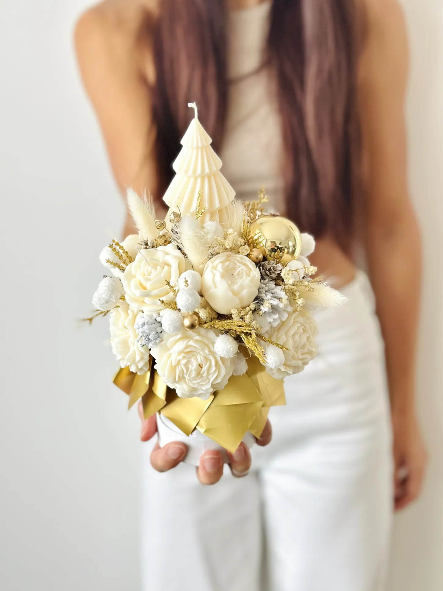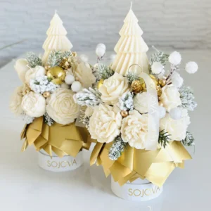 Stwórz magiczny klimat Świąt w swoim domu z naszym świątecznym flowerboxem ze świec sojowych ze złotymi dodatkami i choiną w rozmiarze XS. To niewielka, ale niezwykle efektowna dekoracja, która łączy naturalne materiały z eleganckim, złotym wykończeniem.