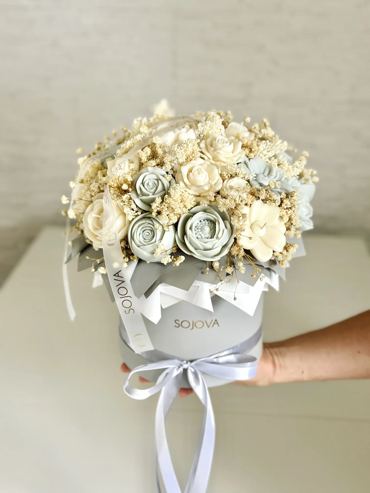 Ręcznie wykonany flowerbox w szarym pudełku, utrzymany w naturalnej kolorystyce szarości i kremu.