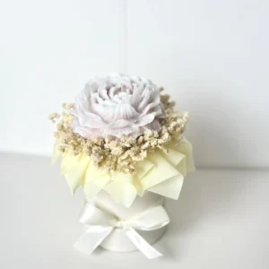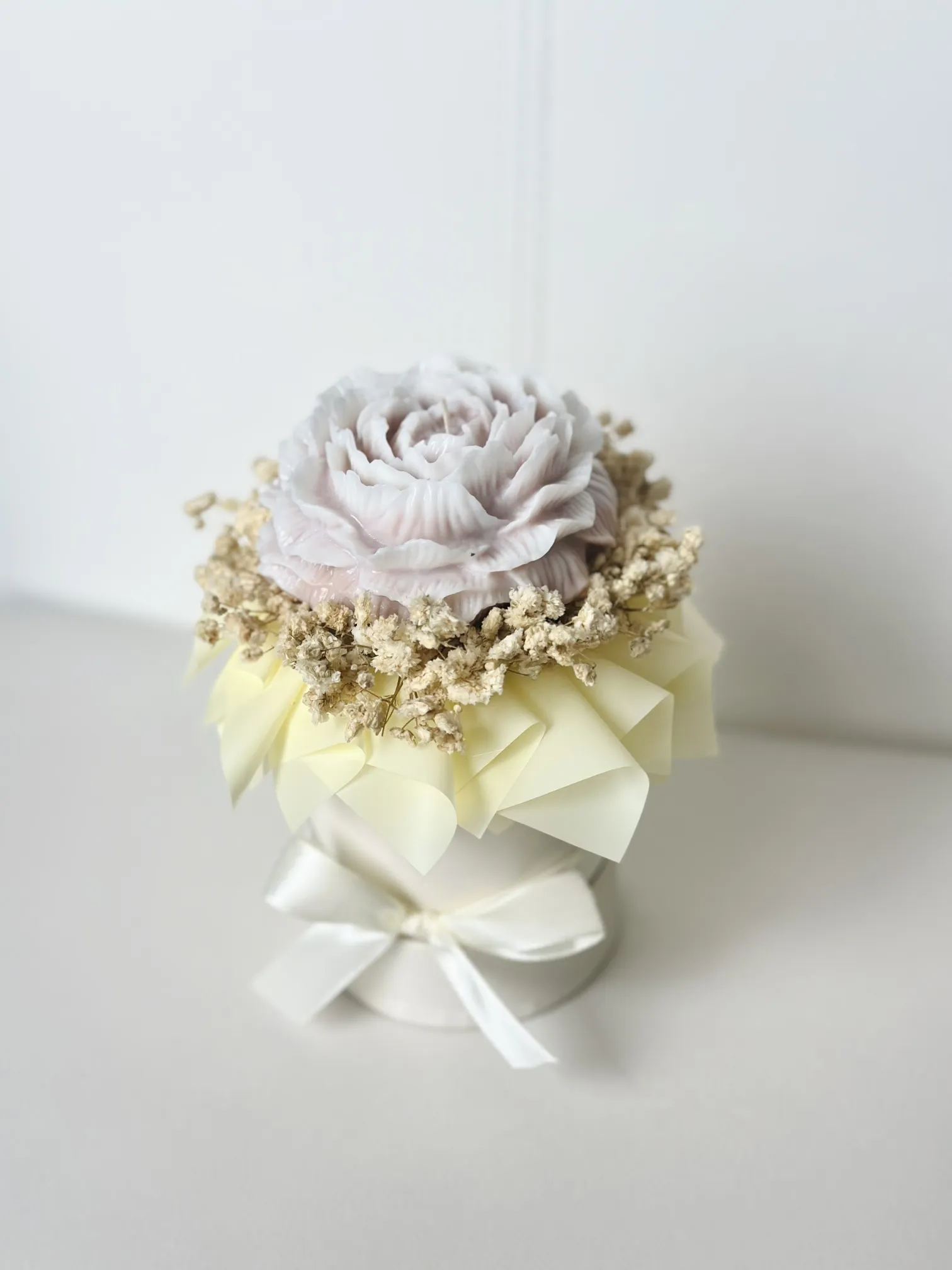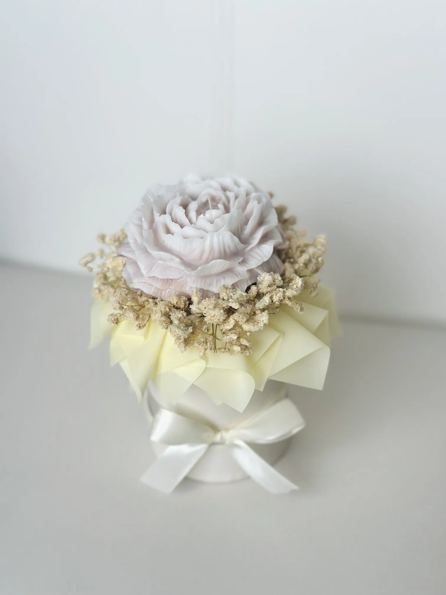 Delikatny mini flowerbox w odcieniach beżu i kremu z ręcznie wykonaną świecą sojową w kształcie piwonii. Subtelna, kompozycja inspirowana pięknem kwiatów sprawia, że całość wygląda jak mały, elegancki bukiet zamknięty w pudełku.