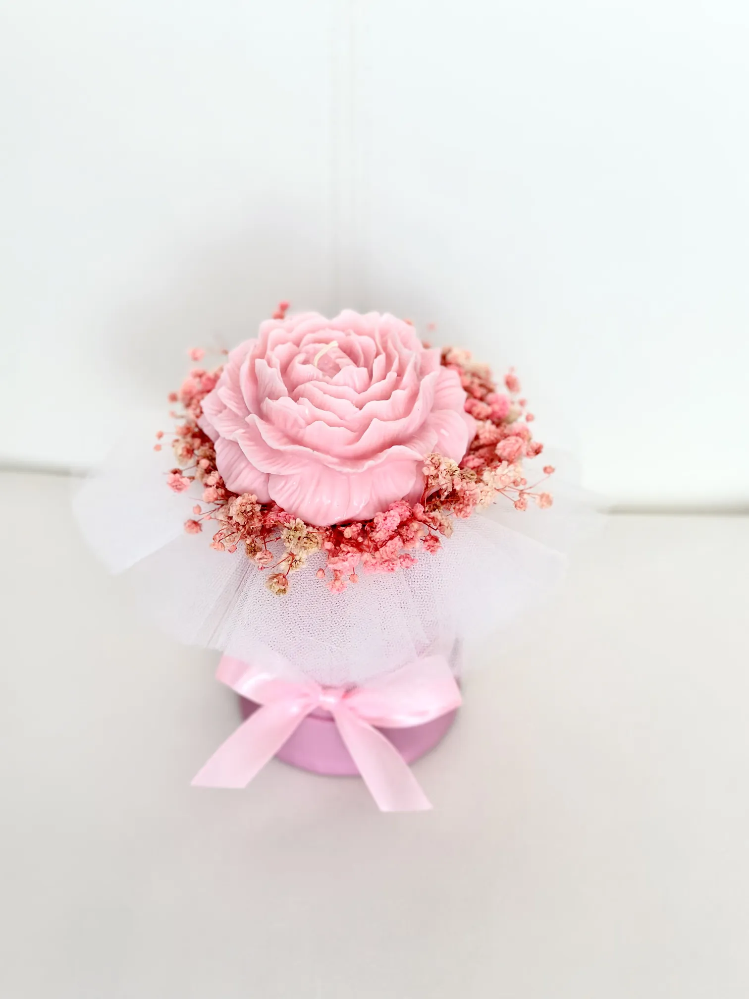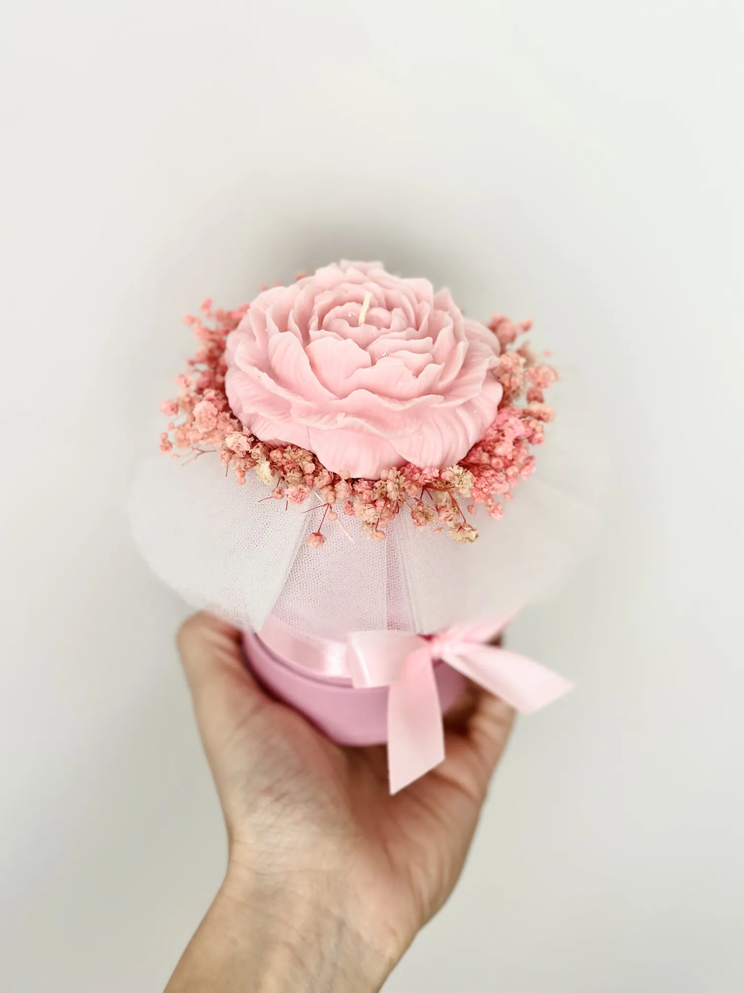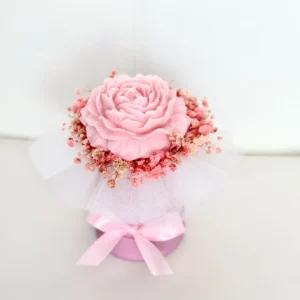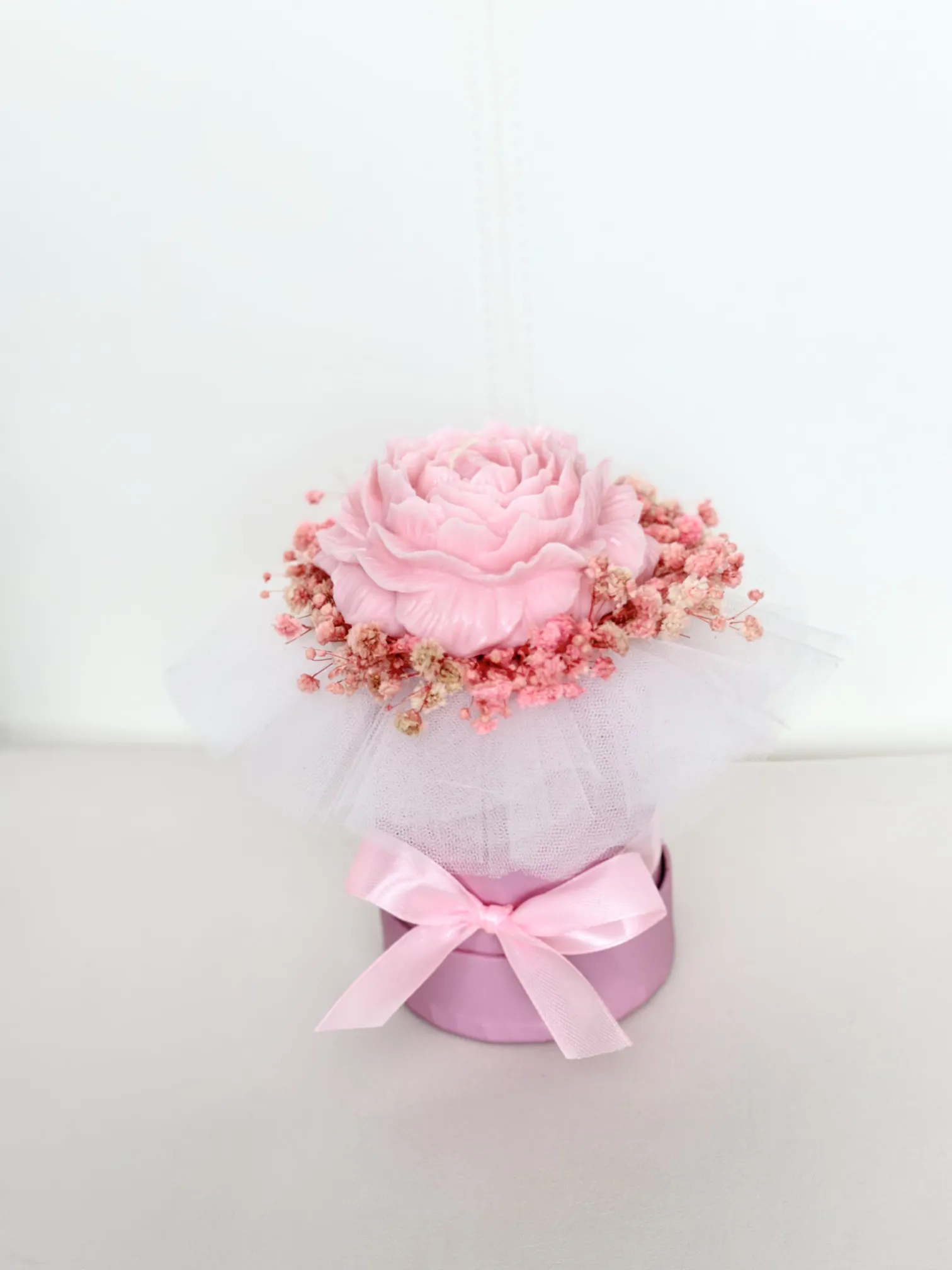 Delikatny mini flowerbox w odcieniach różu z ręcznie wykonaną świecą sojową w kształcie piwonii. Subtelna, kobieca kompozycja inspirowana pięknem kwiatów sprawia, że całość wygląda jak mały, elegancki bukiet zamknięty w pudełku.