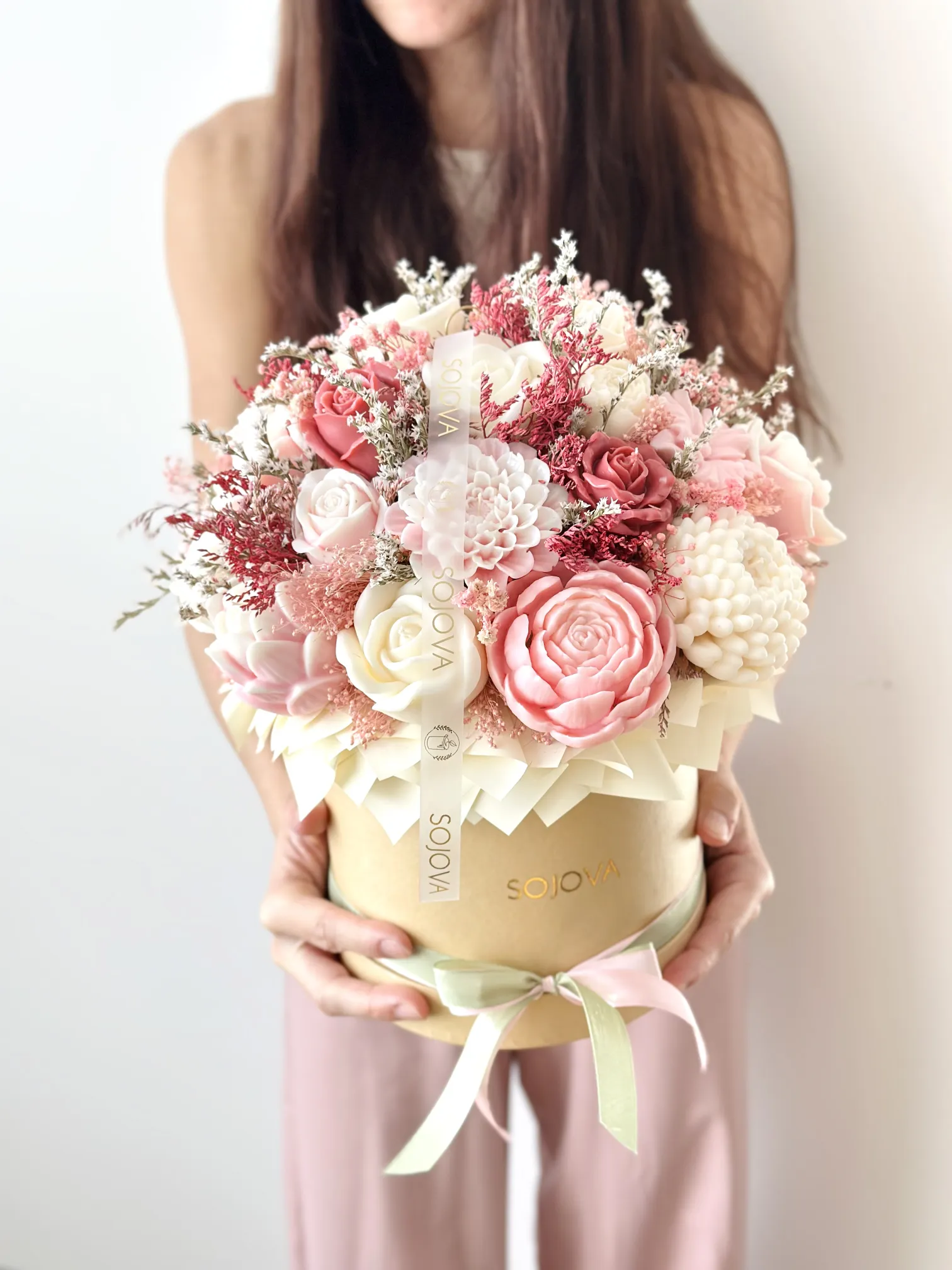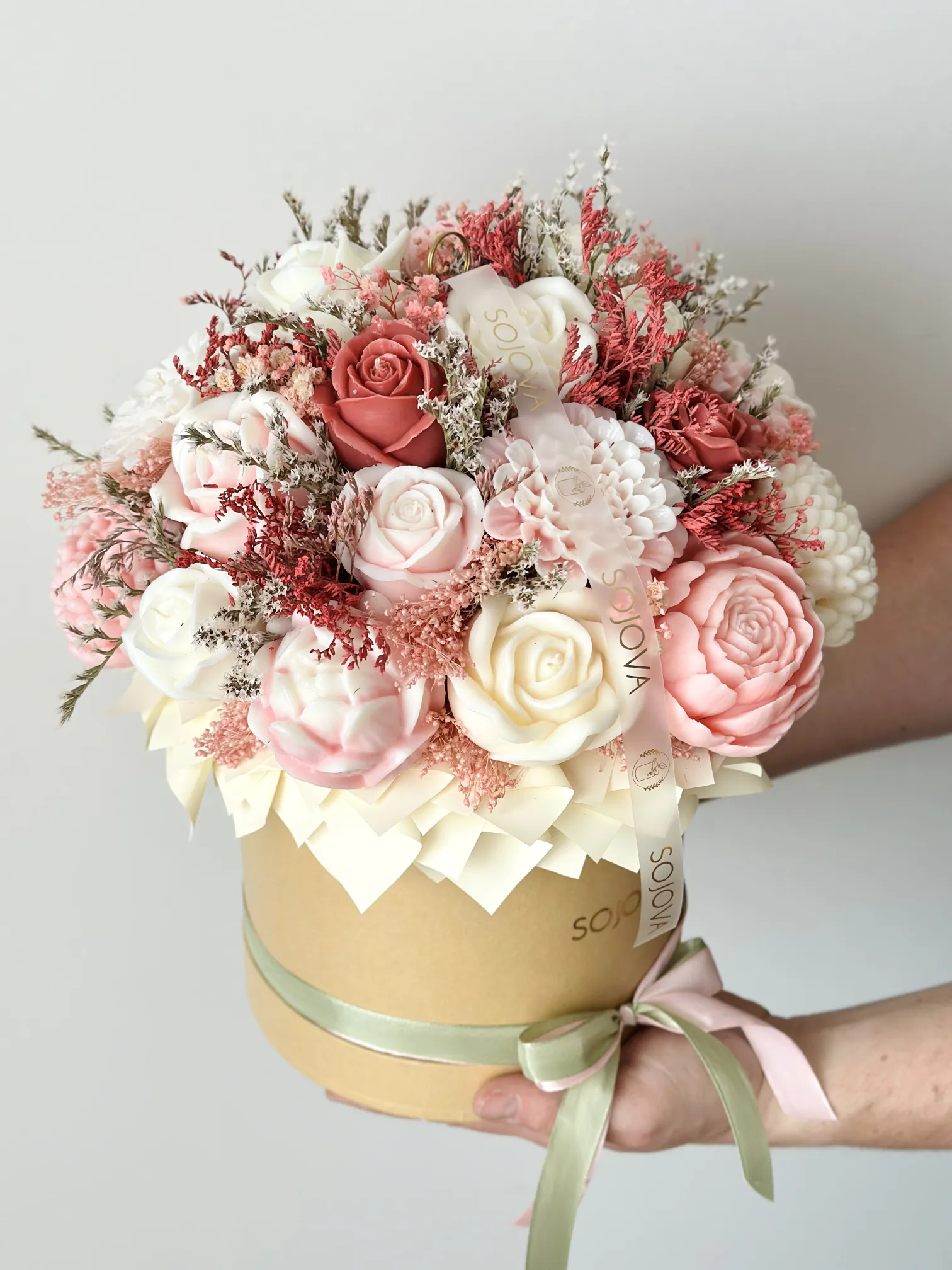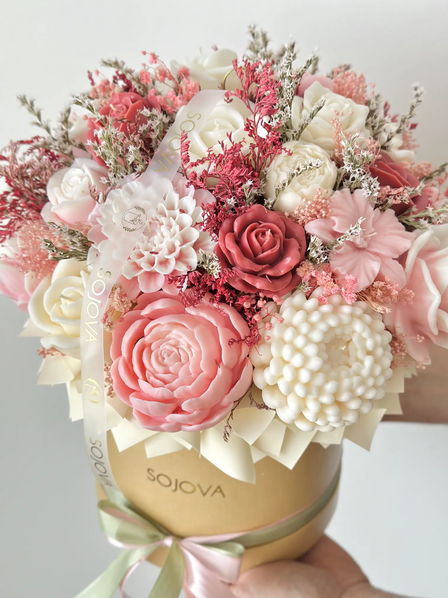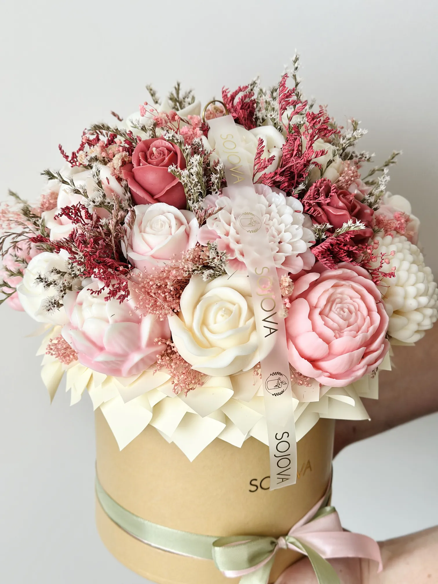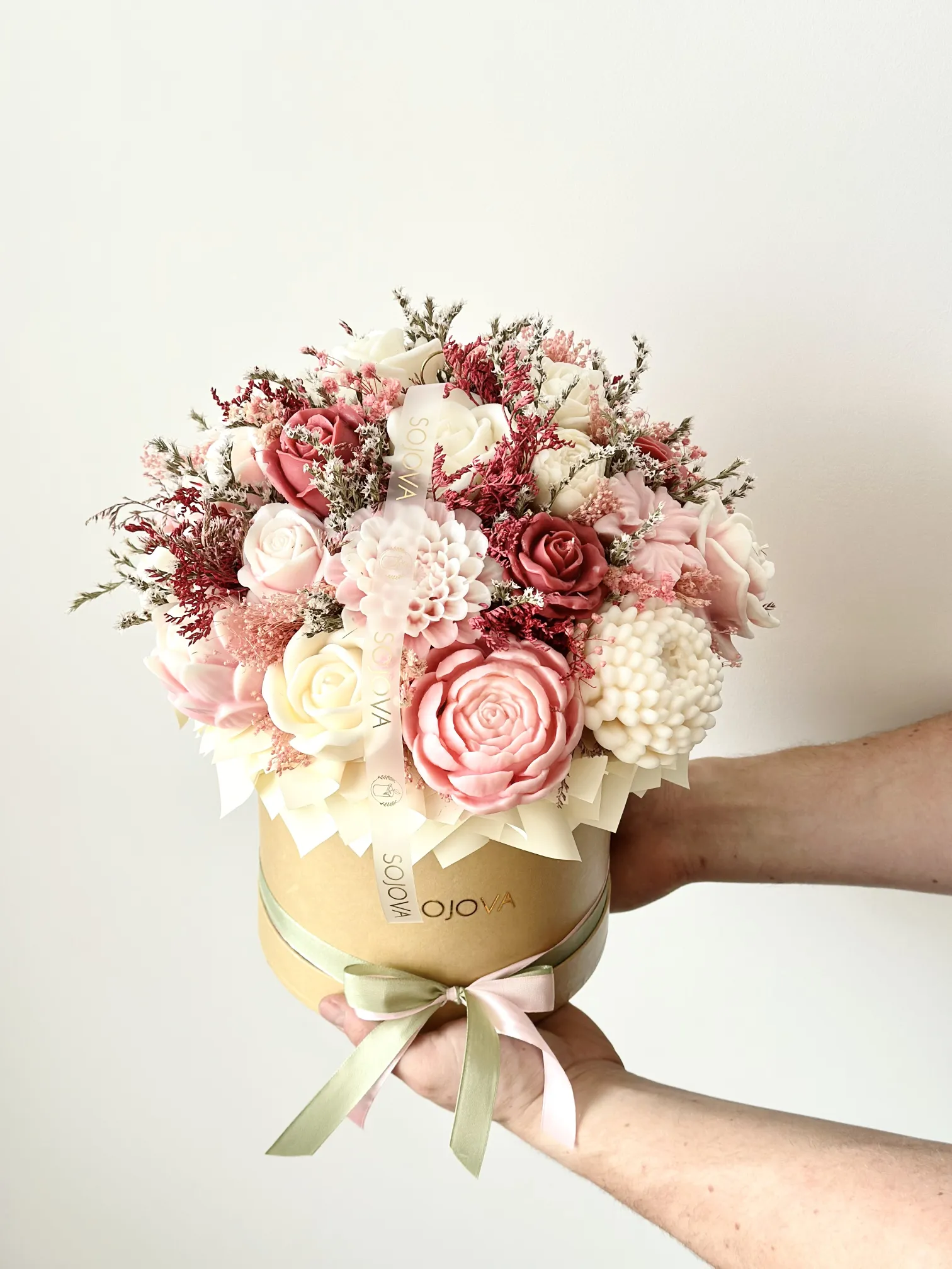 Elegancki flowerbox w rozmiarze L z pięknymi świecami sojowymi w odcieniach różowym, kremowym i bordowym, umieszczonymi w stylowym beżowym pudełku. Starannie dobrane kolory tworzą harmonijną i elegancką kompozycję, która świetnie sprawdzi się jako dekoracja wnętrza lub wyjątkowy prezent.