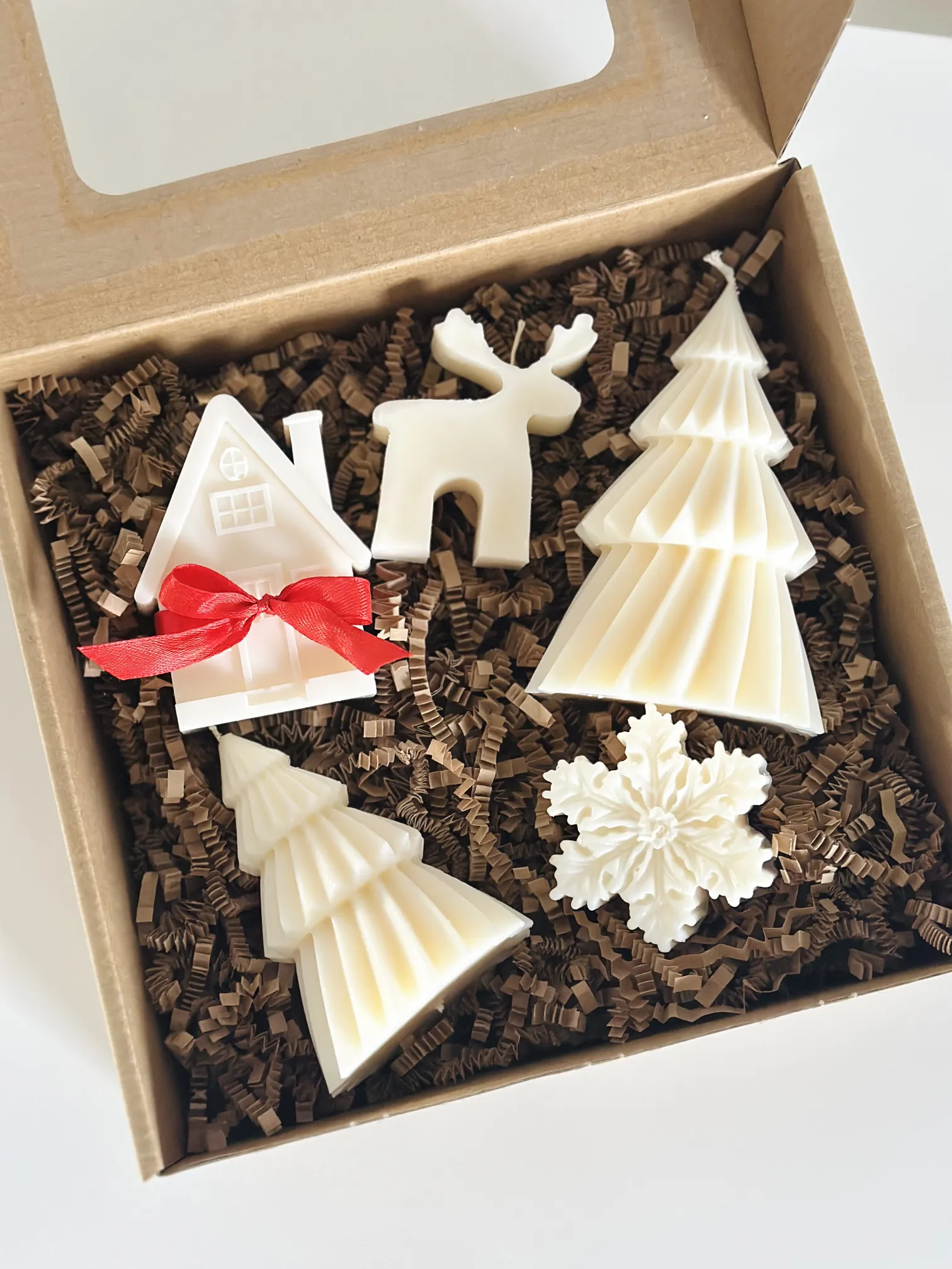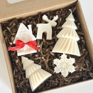 🎁 Świąteczny Zestaw 5 Świec Sojowych – choinka M, choinka L, śnieżynka, domek świąteczny, renifer S