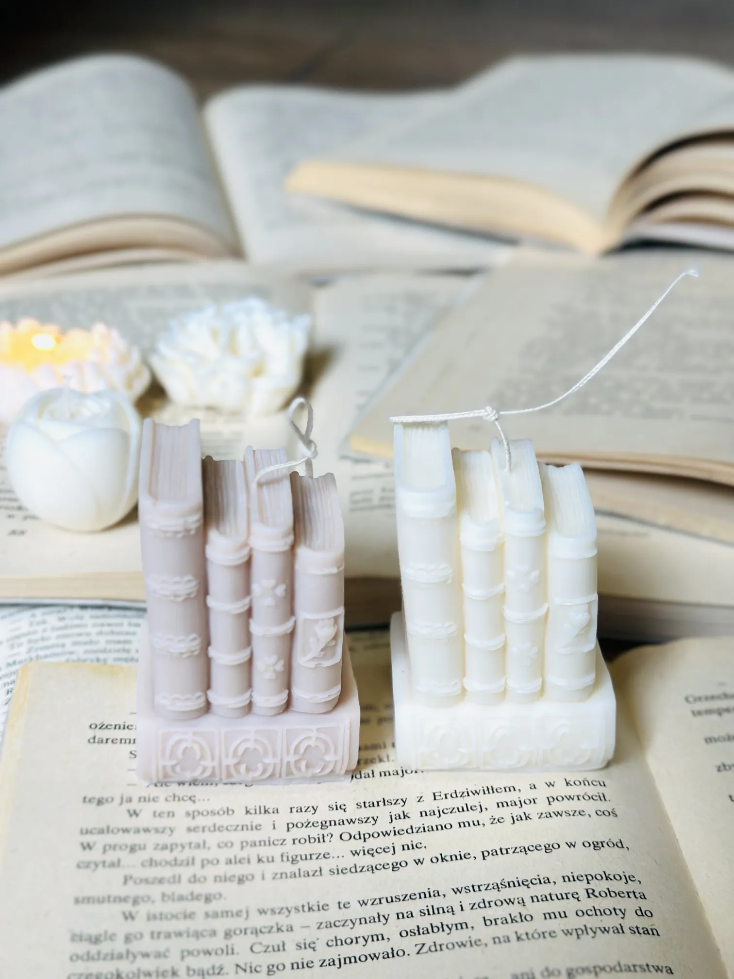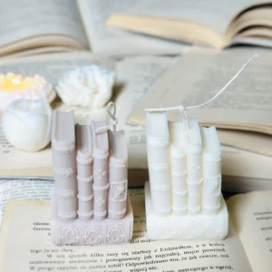 Ręcznie wykonana świeca sojowa w oryginalnym kształcie stosu książek, idealna dla miłośników literatury i niebanalnych dekoracji wnętrz. To subtelny dodatek, który wprowadzi do każdego pomieszczenia ciepły, relaksujący klimat.