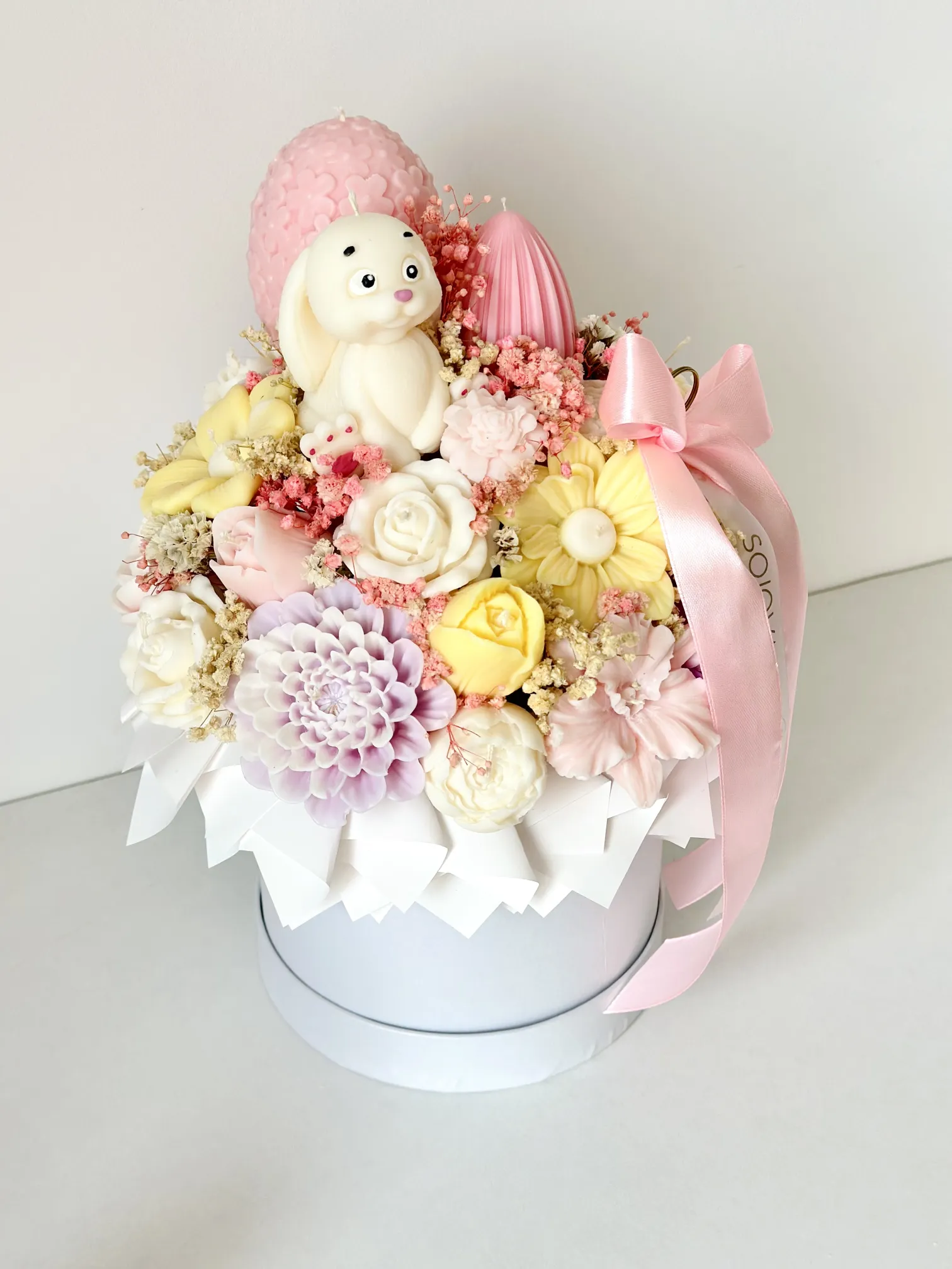 Wielkanocny flowerbox ze świec sojowych z zajączkiem i jajkami w rozmiarze M to elegancka i wyjątkowa dekoracja, która wprowadzi do wnętrza ciepły, wiosenny klimat i podkreśli świąteczny charakter Wielkanocy. Kompozycja została wykonana ręcznie z dbałością o każdy detal i zawiera naturalne świece z wosku sojowego, które palą się dłużej niż tradycyjne świece parafinowe, nie kopcą i są przyjazne dla środowiska.