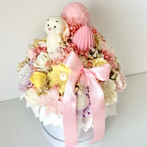 Centralnym elementem dekoracji jest uroczy zajączek wielkanocny otoczony ozdobnymi jajkami oraz subtelnymi, wiosennymi dodatkami w pastelowej kolorystyce. Całość umieszczona jest w stylowym pudełku typu flowerbox, dzięki czemu prezentuje się nowocześnie i luksusowo.