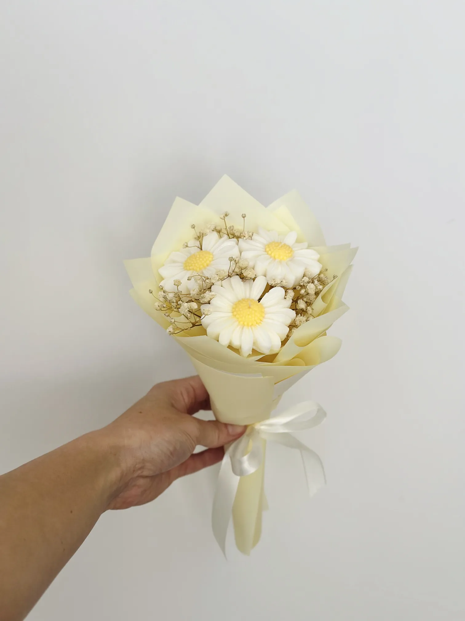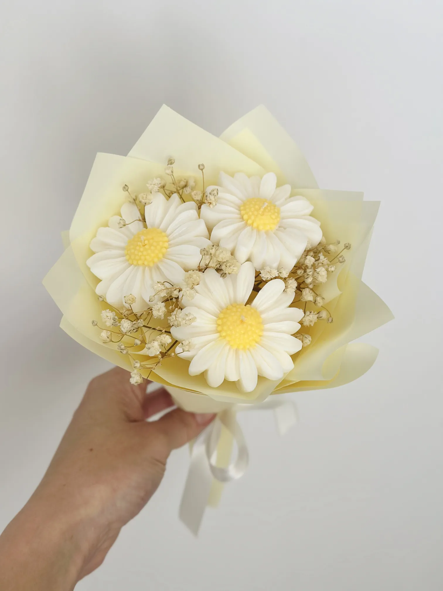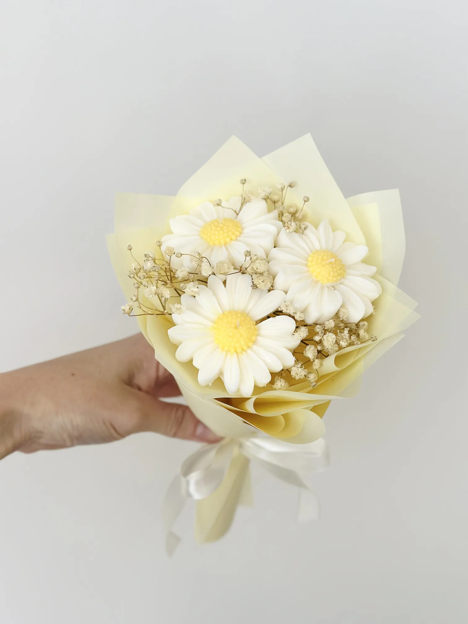 Delikatny bukiet wykonany z ręcznie robionych świec sojowych w kształcie stokrotek. Inspirowany wiosenną łąką, pełen lekkości, naturalnego uroku i ciepła. Każdy kwiat to mała świeca, która tworzy wyjątkową dekorację i jednocześnie może wypełnić dom przytulnym światłem.